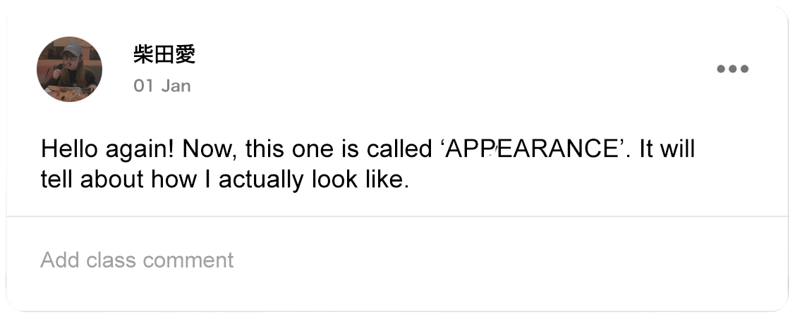 Hello again! Now, this one is called 'APPEARANCE'. It will tell about how I actually look like.