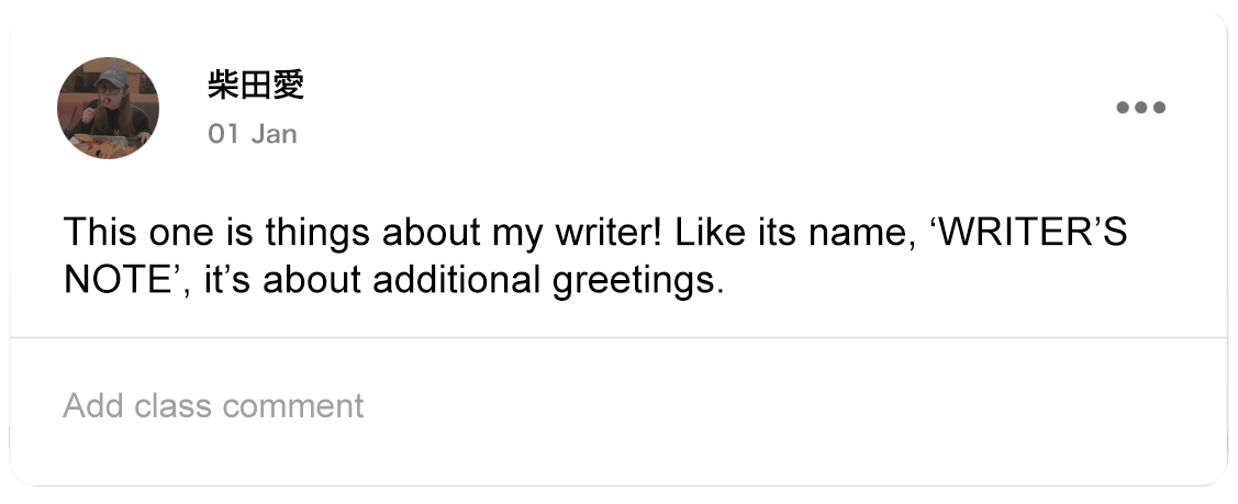 This one is things about my writer! Like its name, 'WRITER'S NOTE', it's about additional greetings.